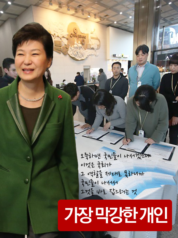 이 나라에서 가장 힘센 ‘개인’들이 주도하는 이 서명운동은 무엇을 뜻하는가. 결국 저들, 저토록 막강한 ‘개인’들은, 허술한 민주주의 시스템과 무력한 시민을 조롱하는 것이다. 그 점에서 ‘일베’와 다를 바 없다. 아니, 저들은 일베보다 훨씬 해롭다. 일베는 저들처럼 힘이 세지 않다. 게다가 서로 간의 ‘친목질’도 ‘극혐’한다. 한 몸처럼 움직이는 재벌과 대통령과 총리에 비하면 일베가 차라리 청결해 보일 지경이다.