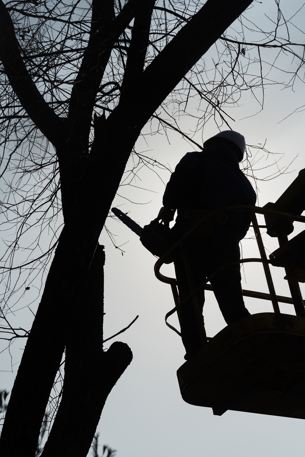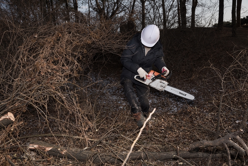산림기능사 김상익(57)씨가 안전모를 쓰고 스틸(STIHL) 기계톱을 꺼낸다. 손잡이를 잡아당긴다. ‘부릉’ 소리가 난다. 시동이 걸렸다. 상익씨가 크레인에 올라 안전벨트를 묶는다. 붐대가 팔을 뻗어 그를 허공에 올린다. 12m 상공에 멈춘 상익씨가 오른손으로 기계톱을, 왼손으로 나무를 잡는다. 윙윙위이이이이이윙~. 나무가 잘려나가기 직전, 그가 왼손으로 나무의 방향을 바꾼다. 잘린 버드나무가 두 그루의 메타세쿼이아 가지 사이로 떨어진다. 크레인을 끝까지 올려 다시 기계톱을 돌린다. 꼭대기 잔가지들이 차례로 잘려나간다. 왼손을 펴 아래 방향으로 흔들다 주먹을 쥔다. 크레인이 멈추자 다시 톱질이 시작됐다. 잘 벼려진 톱날에 굵은 가지가 맥없이 잘려나가 쿵 하고 바닥에 떨어진다. 15m 높이 버드나무가 작은 토막으로 분해되어 쌓이더니 마침내 나무 기둥만 남았다. 이번엔 쌍용씨가 기계톱을 든다. 긴 톱날이 나무에 45도 각도의 < 모양을 만든다. ‘수구 딴다’고 한다. 톱날이 나무에 물리지 않고, 원하는 방향으로 넘어지게 하기 위해서다. 한아름 넘는 밑동에서 톱밥이 쏟아진다. 드디어 나무 한 그루가 온전히 잘렸다. 트럭에 가득 실린 나무토막이 파쇄장으로 향한다. 기계 입속으로 빨려 들어간 나무들이 톱밥으로 변신한다. 톱밥은 식물원과 정원 바닥에 깔려 습도를 보호하는 역할을 하게 된다. “호수 주변 산책로가 엉망이었어요. 나무란 나무는 다 등나무가 감고 있었죠. 몇 년 전 겨울에 작정하고 나무를 싹 다 베어냈어요. 능수벚나무를 심었으면 더 좋았을 텐데 좀 아쉽죠.” 조경사 최중기(58)씨가 관리하는 장미원에는 5만 본의 장미나무가 심어져 장미 축제를 기다리고 있다. 기계톱(체인톱, 엔진톱)은 1918년 스웨덴에서 2인용으로 개발되었고, 지금 쓰는 1인용 기계톱은 제2차 세계대전 중 미국에서 만들어졌다. 원동기에서 얻어지는 동력이 동력 전달부를 거쳐 톱날에 전달된다. 기계톱의 생명은 톱날. 단단한 나무나 오래된 고사목을 자르면 날이 무뎌진다. 각도에 맞춰 줄을 밀면서 날을 정교하게 갈아야 벌목이 수월해진다. 조경사는 경치를 꾸미는 사람이다. 장미원을 만드는 외곽 조경에서 동물사 실내 조경까지 조경사의 손끝에서 공원이 완성된다. 산책로의 의자 하나도 조경의 영역이다. 얼마 전 쌍용씨와 동료들은 나무탁자 128개를 만들었다. 좋은 계절이 돌아오면 공원을 찾은 시민들이 의자에 앉아 쉬어가게 하기 위해서다. 봄부터 가을까지 조경사의 손에 가장 많이 들려 있는 연장은 예초기. 최근 최신형 승차식 잔디깎기인 컵카덱(cub cadet) 예초기 두 대가 들어와 능률이 대폭 올랐다. 공원에는 쥐똥나무, 철쭉, 회양목과 같은 울타리용 관목이 많다. 전정기(잔디깎기)를 사용해 예쁘게 다듬어주는 일도 조경사의 몫이다. 간단한 가지치기도 나무에 따라 다르다. 목수국처럼 싹이 나서 올해 꽃이 피는 나무가 있고, 무궁화처럼 2~3년 후에 피는 꽃도 있기 때문이다. 겨울마다 계약 종료되는 쪼개기 계약직