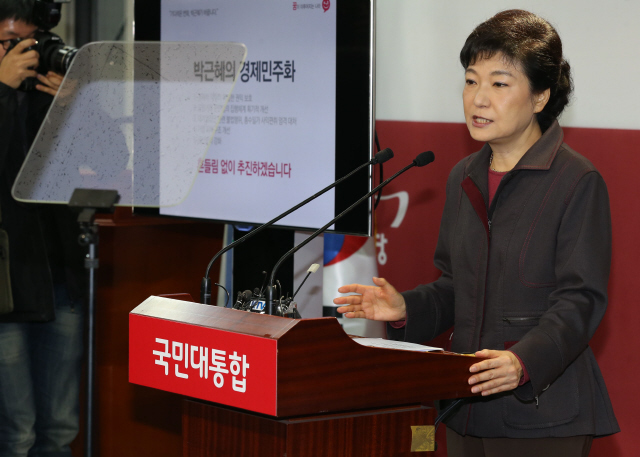 2012년 대선에서 새누리당 후보였던 박근혜 대통령은 ‘고용안정 및 정리해고 요건 강화’를 추진하겠다고 천명했다. 2012년 12월16일 ‘박근혜의 경제민주화’ 공약을 발표하는 모습. 한겨레 이정우 선임기자