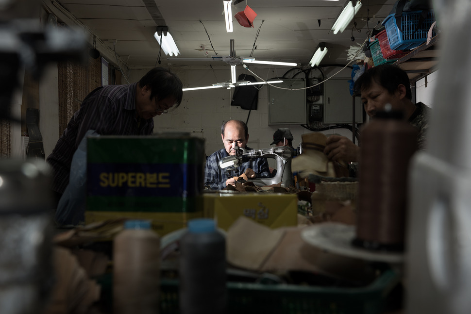 “손재주는 물론 예술성이나 창의성도 있어야 하는 작업이에요. 이태리 구두장이들은 하루에 다섯 족 정도 만든다고 해요. 신발 한 켤레가 500불 이상이니까 소량 생산해서 제값 받고 파는 거죠.” 고등학교 1학년 나이부터 37년 동안 구두를 만든 홍노영씨는 구두 만드는 일이 자랑스럽다. 제화공의 손끝에서 구두의 맵시가 연출되기 때문이다. 종훈씨가 열 손가락을 펴서 보여준다. 첫째 마디에 지문이 보이지 않는다. “주민등록증 만들 때 지문이 안 나와서 몇 번씩이나 찍었어요. 얼마 전 여권 만들 때도 컴퓨터가 지문을 인식하지 못해 엄청 애를 먹었죠.” 멋진 수제구두는 구두장이의 지문으로 만들어진다. “제가 구두를 처음 배우던 1970년대 말 구두 한 켤레가 1만2천원이었고 마진율이 70%를 넘었어요. 그 시절 명동의 멋쟁이들은 모두 구두장이였어요.” 노영씨가 지나간 시절을 떠올린다. 1990년대까지만 해도 손기술 좋은 구두장이들은 먹고살 만했다. 금강제화 공장이 성수동에 있던 시절, 금강 본사에서 일하는 제화공의 한 달 봉급은 15만원, 금강에서 하청받아 일하는 제화공은 30만원을 벌었다. 회사에 매여 일하기 싫어하는 구두장이들은 성수동 작은 구둣방에서 구두를 만들었고, 구두 기술자들은 그만한 대우를 받았다. 금강과 함께 3대 구두 업체인 엘칸토, 에스콰이어와 백화점 고급 구두 소다, 텐디, 리소페도 모두 그의 칼판을 거쳐갔다. 27만원짜리 구두 한 켤레 공임비는 1만2천원 일반 구두는 합성피혁을 소재로 기계를 이용해 대량 생산한다. 반면 수제구두는 겉감과 안감 모두 천연 가죽을 이용해 만든다. 재단→갑피→저부→완제품으로 이어지는 대부분의 공정이 구두장이의 손과 구두 재봉으로 만들어진다. 중창이라고 부르는 신발 바닥도 발바닥의 곡선을 살리기 위해 얇은 쇠를 두드려 만들기 때문에 기성화에 비해 가볍고 튼튼하다. 고객의 주문에 맞춰 만드는 맞춤형 수제화는 서울 염창동과 성수동, 대구의 수제화 골목에서 만들고, 유명 구두회사의 수제화는 성수동에서 만들어진다. “제 손으로 만든 구두가 도심을 누비는 걸 보면 가슴이 뿌듯하죠.” 설 명절에도 그의 손끝에서 만들어진 멋들어진 구두들이 유명 상표를 달고 상점에 진열되어 멋을 아는 주인을 기다린다. 2000년대에 들어서자 신자유주의 세계화 바람이 구두업계를 휩쓸었다. 사업주들은 인건비가 싼 중국과 동남아로 빠져나갔다. 구두 대기업들은 공장에서 구두를 만들던 정규직 노동자를 ‘소사장’으로 대체했다. 성수동 제화공들이 만드는 구두의 납품 가격도 곤두박질쳤다. 지난해 7월 서울시 산하 연구기관인 서울연구원은 광복 이후 70년간 서울의 변화상을 정리했다. 1948년 서울에서는 목수와 제화공의 임금이 현재 화폐 기준으로 각각 월 12.1원, 10.7원으로 회사원(9.3원), 공무원(4.4원)보다 많았다. 70년 후인 2014년 사무종사자(회사원, 공무원)의 평균 월급은 301만원인 데 비해 제화공(섬유 및 가죽 관련 기능 종사자)의 월급은 183만원에 그쳤다. 설 명절 노영씨와 동료들이 만든 수제구두는 매장과 홈쇼핑에서 27만원 안팎으로 팔린다. 그런데 신발 한 족을 만드는 인건비는 얼마일까? 구두회사는 광고비와 재고 부담을 이유로 구두 한 족당 공임비로 갑피와 저부공장에 각각 5500~6000원을 준다. 판매가의 4.4%가 40년 경력 구두 기술자의 몫이다. 수제구두는 디자인이 까다로워 신발 한 족 만드는 데 1시간 넘게 걸린다. 설을 앞두고 네 명의 제화공이 하루 15시간씩 이틀을 꼬박 만들어 단화 100족을 납품해 55만원을 받았다. 1인당 하루 일당이 7만원, 시급 4700원인 셈이다. “우리 아들이 극장 알바하는데 야간까지 하면 8500원 넘게 주더만. 30년 넘게 일했는데 알바보다 못하다니까. 아침 7시에 나와서 밤 10시까지 일하는데 하루 10만원을 못 벌어요.” 종훈씨가 긴 탄식을 내뱉는다. 구두장이의 신세가 이렇다보니 일을 배우려는 젊은이가 없다. 쉰 살이 넘은 종훈씨가 이 동네 막내다. 서울시가 ‘제화의 거리’를 조성하고 수제구두 공동판매장을 만드는 등 여러 지원을 하고 있지만, 하루 15시간 ‘본드 냄새’를 마시며 커피전문점 알바보다 못한 대우를 견디겠다는 청년이 있을 리 없다. “구두 대기업들이 공정한 거래만 해준다면 후배들도 장래를 걸고 일을 배워볼 수 있을 텐데, 현재로선 그럴 가능성이 전혀 없어요. 결국 이 좋은 구두 기술이 사장되는 거죠.”