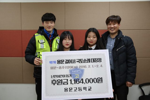 용문고는 이종국 교장선생님의 제안으로는 매해 국토순례 대장정 행사를 열고 있다. 올해가 17번째다. 후원금 모금은 올해가 처음이다. 지난 2월1일 아침 8시 용문고 1~3학년 학생 90명과 교사 13명이 학교에 모여 출정식에 참가한 뒤 걷기 시작했다. 하루 26~36km씩 3박4일에 걸쳐 경기 양평~여주~충북 음성~충주 중앙탑으로 이어지는 120km를 걷는 대장정이었다. 학생들은 준비해간 식재료로 직접 음식을 조리해 식사를 해결하며 모처럼 야외활동의 즐거움을 느끼기도 했다. 긴 여정에 지쳐 중간에 포기하는 학생들도 생겼다(5명). 참가 학생들은 지친 친구의 가방을 들어주며 서로 완주를 응원하는 우정을 보이기도 했다고 강 교사는 전했다.