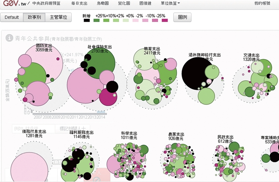 대만 거브제로 사이트의 ‘정부예산 시각화’ 작업. 500쪽짜리 PDF 자료를 누구나 한눈에 알아볼 수 있도록 인터랙티브 원그래프를 통해 시각화했다. 거브제로 홈페이지 갈무리