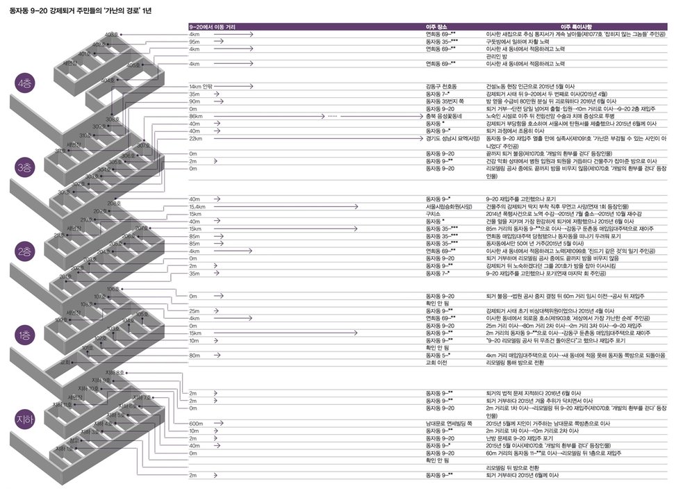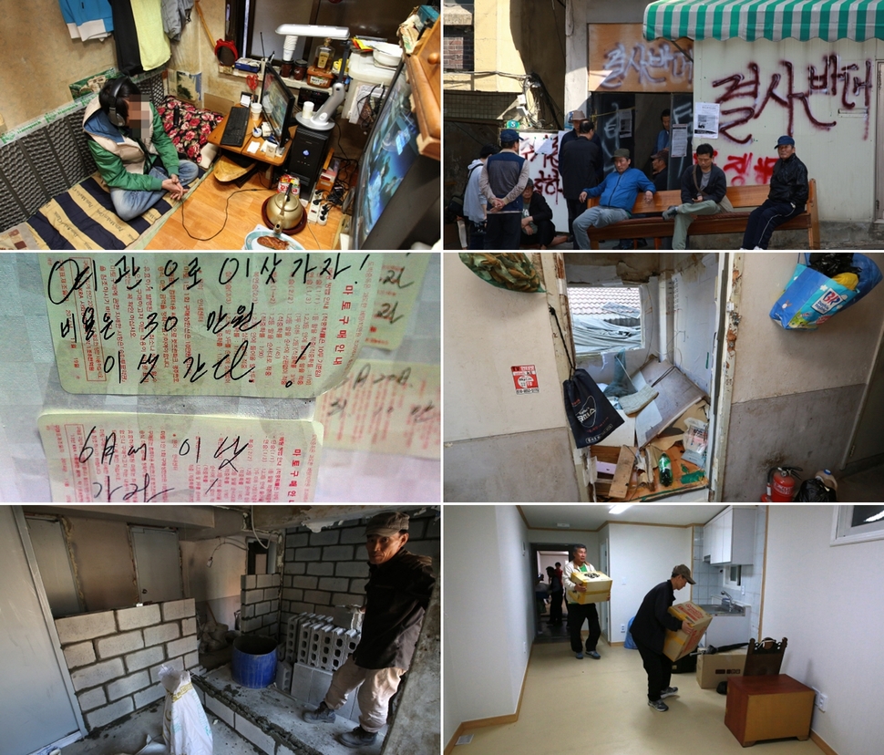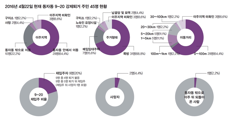 박철관은 16년 살아온 방을 결국 비웠다. 동자동 안에서 직선거리 35m 떨어진 쪽방으로 이사했다. 9-20에선 없었던 보증금을 50만원 걸었고 월세가 3만원(15만원→18만원) 올랐다. 강제퇴거 1년 동안 동자동 9-20 주민 45명 중 29명(64.4%)이 동자동 안을 벗어나지 못했다. 그들 전원이 밧줄에 몸을 묶은 듯 직선거리 100m 안에서 움직였다. 김형구도 2년 살았던 방(해당 번지에서는 6년째)을 결국 비웠다. 260m 거리의 중구 퇴계로 쪽으로 짐을 날랐다. 철거구역 안에 살던 쪽방·고시원 주민 중 30명의 소재를 중구청이 파악했다. 그들 중 22명(73.3%)이 중구에 머물렀다. 8명은 용산구(4명)와 구로구(2명), 동대문구(1명), 종로구(1명)로 흩어졌다. 19명(63.3%)이 쪽방으로 이사했고 6명은 고시원에 방을 얻었다. 28명이 수급자였고 13명이 65살 이상 고령자였다.