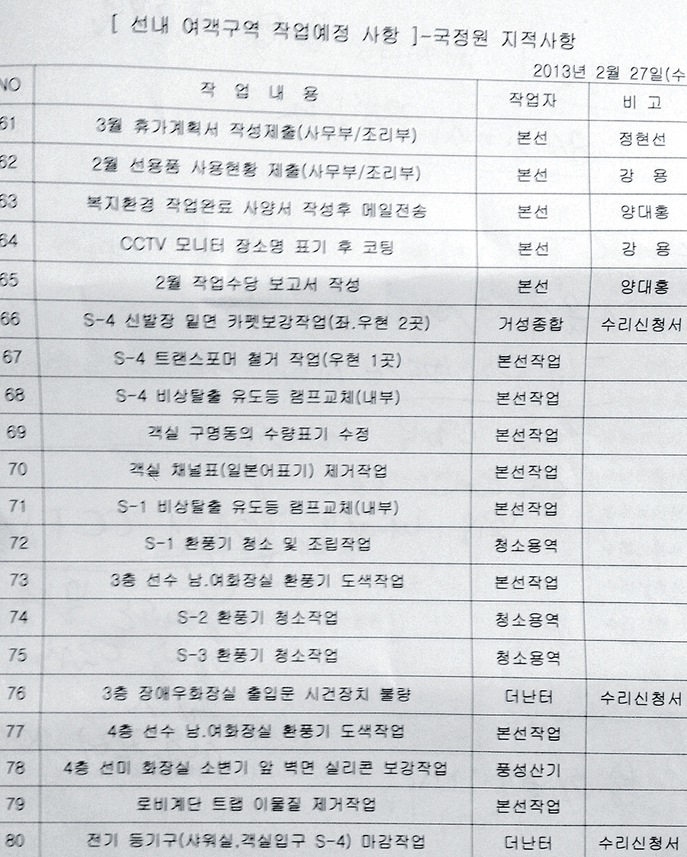 문서 작성일은 2013년 2월27일로 기록돼 있다. 내용은 선박 내 설비·비품, 직원 관리 등에 관한 업무 예정 사항이었다. 1번부터 100번까지 항목을 매겨 폐회로텔레비전(CCTV), 표지판 등 예정 설비작업이나 직원 휴가계획서, 작업수당 보고서 작성 계획과 담당자 이름을 적었다.