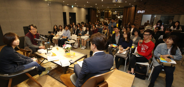 4월28일 서울 동교동 ‘미디어카페 후’에서 열린 필독콘서트 모습. 정은주 기자(왼쪽), 박준도 사회진보연대 노동위원장, 안수찬 <한겨레21> 편집장(뒷모습)이 대담하고 있다. 류우종 기자