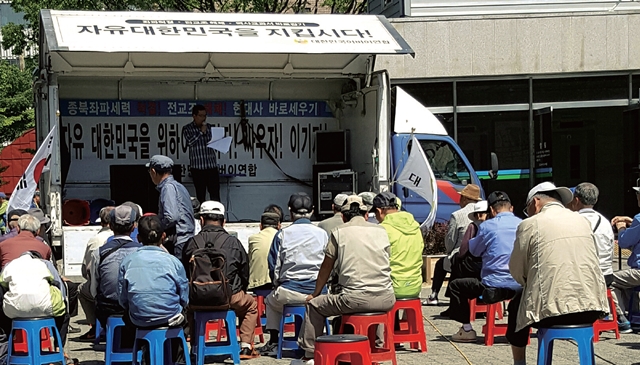 안보강연회는 공사를 위해 종묘공원 안쪽에 둘러친 펜스 사이에서 열렸다. 100명에 가까운 노인들은 플라스틱 의자를 그늘진 곳에 끌어다놓은 뒤 그 위에 몸을 걸쳤다. 더운 날씨였다. 이날 오후 2시쯤 되자 추 총장이 방송차량 위에 올랐다. 연설이 시작됐다. 민방위 훈련을 알리는 사이렌 소리가 크게 울렸지만 누구도 아랑곳하지 않았다.