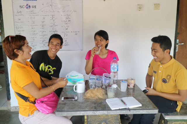 밀라의 코코넛 섬유 가공 공장에서 일행이 모여 담소를 나누고 있다. 왼쪽부터 통역자 와얀 데위, 아안, 밀라, 여행을 안내한 위라.