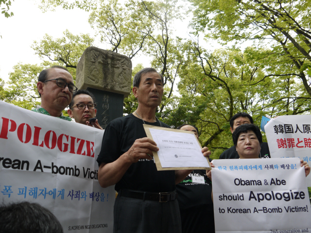 미국 버락 오바마 대통령의 ‘역사적인’ 일본 히로시마 방문은 한국인 원폭 피해자들에게 자신의 막다른 처지를 세상에 알리는 절호의 기회로 여겨졌다. 방문 예정일인 5월27일 오전 한국 쪽 방문단과 일본의 지원단체 관계자들이 히로시마평화공원 내 한국인 원폭 희생자 위령비 앞에서 ‘미국 대통령은 책임을 인정하라’고 촉구했다.