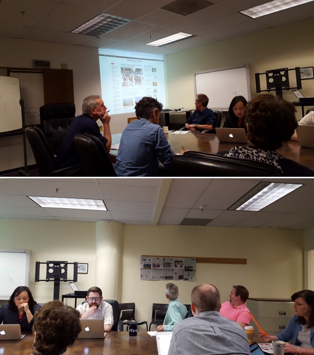 <크로니클>은 아침 뉴스룸을 한 달에 한 번씩 독자에게 공개한다. <크로니클> 역사상 첫 여성 편집국장인 오드리 쿠퍼는 뉴스룸을 디지털화하는 데 앞장섰다. 쿠퍼의 지휘하에 <크로니클>은 미국 내에서 혁신적인 미디어로 거듭나고 있다는 평가를 받는다. 이런 노력 속에 어떻게 뉴스를 만드는지 뉴스룸을 공개하고 독자가 신문에 애정을 갖게 하려는 의도다. 공개된 편집회의를 참관한 뒤 한국에서 함께 간 넥스트저널리즘스쿨 학생들과 크리스틴 고 에디터, 사회 분야 칼럼니스트 C. W. 네비우스를 만났다.