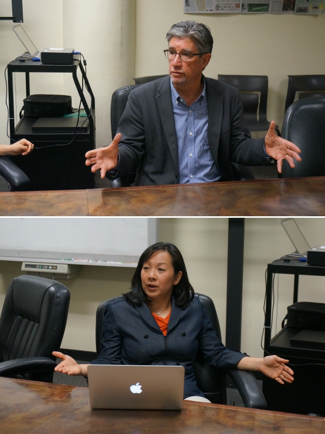 <크로니클>의 사회 분야 칼럼니스트 C. W. 네비우스(위쪽)와 디지털에디터 크리스틴 고가 인터뷰에 응하고 있다. <크로니클>의 디지털화를 이끄는 크리스틴 고는 “긴 기사를 쓸 때 어떻게 온라인에서 기사를 읽을 수 있게 구현할지 고민한다”고 말했다.