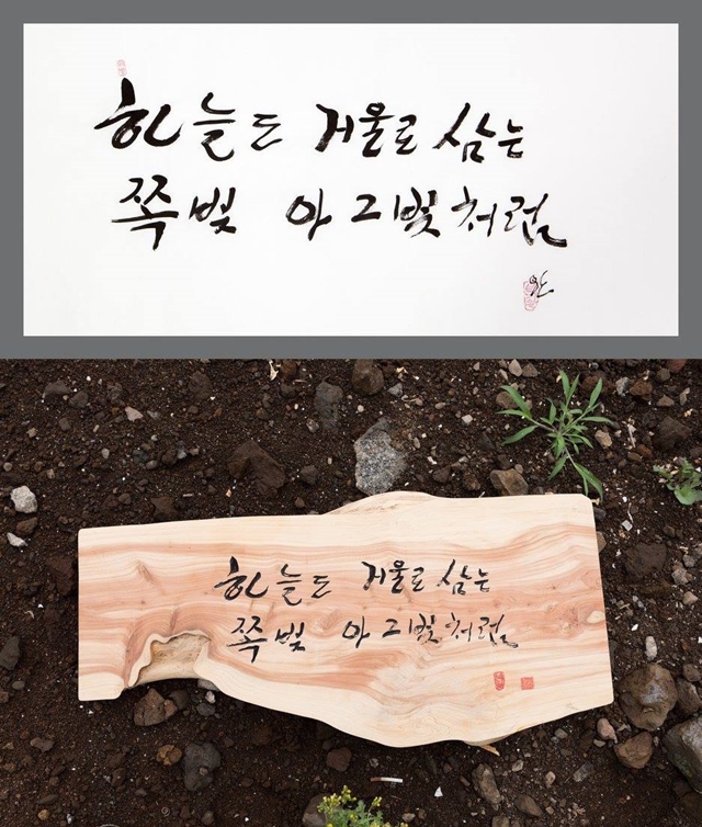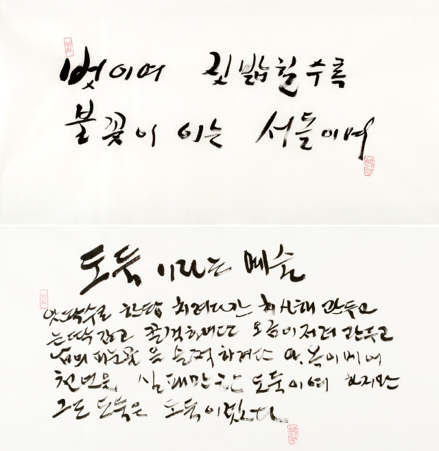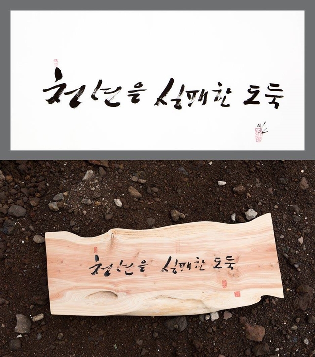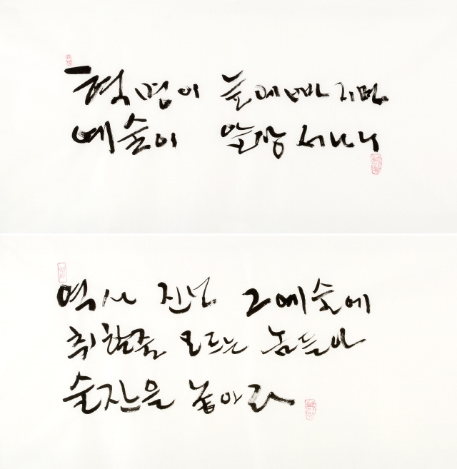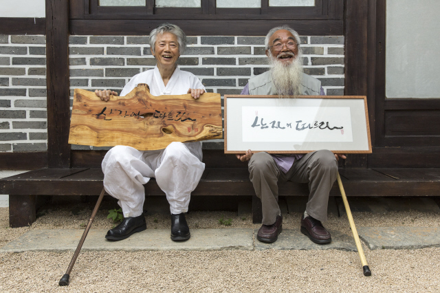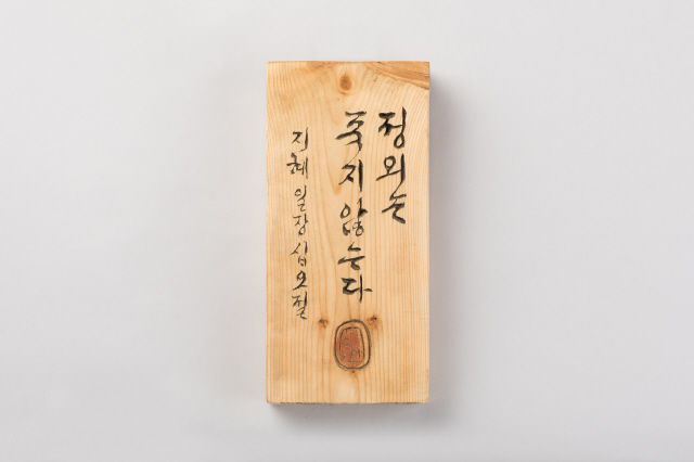 누구인가, 문정현은. “1975년 인혁당 수형자들이 사형선고 하루 만에 형장의 이슬이 되고 시신마저 탈취당할 때, 영구차를 가로막고 몸을 던진 젊은 사제였다. 1976년 박정희 영구집권에 반대하는 3·1구국선언 사건으로 감옥에 갇혔다.” 6월28일 류가헌에서 기자간담회가 열렸다. 사진작가 노순택은 전시회를 성사시키기까지 어려움을 말했다. 두 사람 모두 손사래를 쳤던 것이다. ‘아름다운 사기’가 필요했다. 주최 쪽은 백기완에게 문정현을, 문정현에게는 백기완을 팔았다. 두 사람은 “벽돌 몇 장 보태는 마음으로”(백기완), “노동자들 손잡아주는 마음으로”(문정현) 슬쩍 속아주었다. 전시 작품은 백기완의 붓글씨와 문정현의 새김판(서각)이다. 백기완은 한 달 내내 방에 갇힌 채 다소곳이 쪼그리고 앉아 글씨를 썼다. 40여 점을 내놨다. 문정현은 10년 전부터 투쟁의 여백 시간에 새겼던 목판 글씨를 추렸다. 70여 점을 꺼냈다. 이번 전시에 맞춰 두 사람이 뜻과 손을 모은 공동작품도 선보인다. ‘산 자여 따르라’ ‘천년을 실패한 도둑’ ‘하늘도 거울로 삼는/ 쪽빛 아 그 빛처럼’. 뜻이 거룩하니, 만담이 더 살았다. 유쾌한 말솜씨를 뽐낸 두 사람은 말했다. “여기저기 ‘협박’이 들어와서 동참하게 됐습니다. ‘역사 진보 그 예술에/ 취할 줄 모르는 놈들아/ 술잔을 놓아라’라는 글귀가 있어. 술에 취하는 새끼들은 대폿잔을 놓으라는 말이야. 여러분 좀 널리 알려줘요. 우리가 진짜 술에 취하고 해롱거렸지, 역사·진보 그 절망에 취한 적은 없잖아. 그러면 술을 끊어야 하는 거 아닌가 문제제기를 한 거야.”(백기완) “돈 주고 판다는 건 상상도 못했습니다. 어떤 목사님이 얼마에 파느냐고 해서, 내가 ‘예수님 말씀을 돈 주고 팔아요?’ 했어요. 값을 매길 수는 없는데, 집 짓는 데 도움이 된다면, 작품으로 생각하지 말고, ‘꿀잠’을 위해서 좀 보태주시는 마음으로 가져가셨으면 하는 마음이에요. 고통 속에서 만든 노력이라 생각하고 많이 알려주셨으면 고맙겠습니다.”(문정현) ‘두 어른’전의 목적은 하나다. 비정규노동자의 집 ‘꿀잠’( laborhouse.kr)을 짓는 데 필요한 목돈을 마련하기 위한 것. ‘꿀잠’ 모금은 지난해 여름 시작했다. 아직 목표치의 30% 정도밖에 못 모았다고 한다. 사정이 이러하므로, 이번 전시는 판매도 주목적이다. 두 사람을 장터로 끌어낸 이유다. 백기완·문정현은 ‘모시는 글’에 곡진한 사연을 적었다. “지금도 여기 찬 바닥에서, 저기 뜨거운 굴뚝 위에서 비인간이 된 비정규노동자들이 외롭게 싸우고 있다는 소식이 들려옵니다. 간신히 버티는 게지요. 거리 싸움을 하는 비정규노동자들이 잠시 쉴 곳, 잠시 씻을 곳, 잠시 치료받을 곳이 너무나 절실하다는 얘기에, 나이테 많은 두 사람이 작은 힘이라도 보태고 싶어 용기를 냈습니다. 비정규노동자의 집 ‘꿀잠’을 짓기 위해 글씨 몇 점, 서각 몇 점 달라는데 버틸 재간이 있어야지요.” ‘연대의 단열재’ 두른 집 하나 ‘아름다운 사기’의 공모자 송경동 시인은 헌시로 화답했다. “(…) ‘비정규직 없는 평등한 세상’/ ‘그 누구도 그 누구 위에 군림하지 않는 세상’/ ‘함께 일하고, 함께 나누되, 함께 올바로 잘사는 노나메기 세상’// 그런 세상을 향한/ 아름다운 연대와/ 투쟁과 단결의 집 하나/ (…)”(헌시 ‘생명의 약속-<두 어른>전을 열며’) 우리는 보았다. 마침내 예술에 이른 두 사람을. 노동자들의 예술가를. 비정한 세파 막아줄 ‘연대의 단열재’를 두른 집, ‘꿀잠’을 짓는 예술가를. ※ 백기완·문정현 두 사람은 비정규노동자의 집 ‘꿀잠’ 건립 기금을 보태려고 붓글씨와 새김판(서각)을 내놓았다. 작품 하나하나에 두 사람의 삶과 정신, 세상에 전하는 뜻이 담겨 있다.