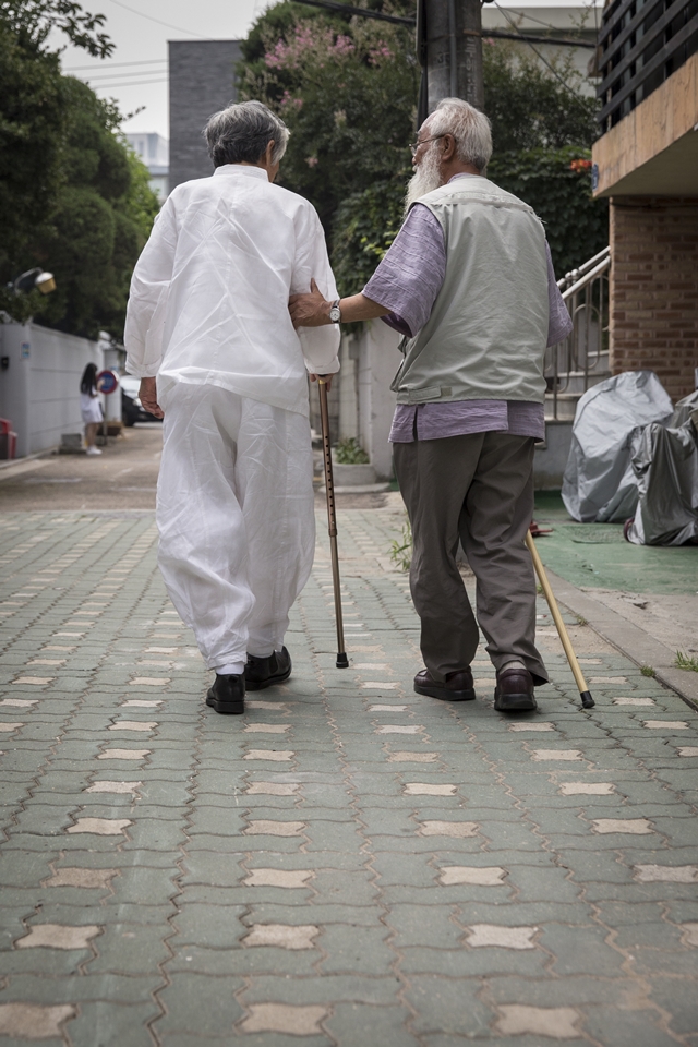 6월28일 서울 종로구 ‘사진위주 류가헌’에서 열린 ‘두 어른’전 기자간담회 뒤 백기완(왼쪽)·문정현이 나란히 골목을 걷고 있다. 박승화 기자