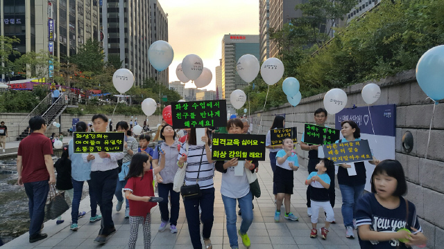 9월3일 한국백혈병어린이재단 주최로 열린 소아암 인식 개선을 위한 걷기 행사에 화상강의기관 학생과 학부모 25명이 참여했다. 이들은 “최근 교육부가 실시간으로 교사와 학생들이 소통할 수 있는 화상강의를 축소하는 대신 일방향으로 진행되는 사이버강의인 원격수업을 도입해 건강장애 아이들의 학습권을 침해하려 한다”고 화상강의 축소 반대를 주장했다. 꿈사랑학부모회 제공