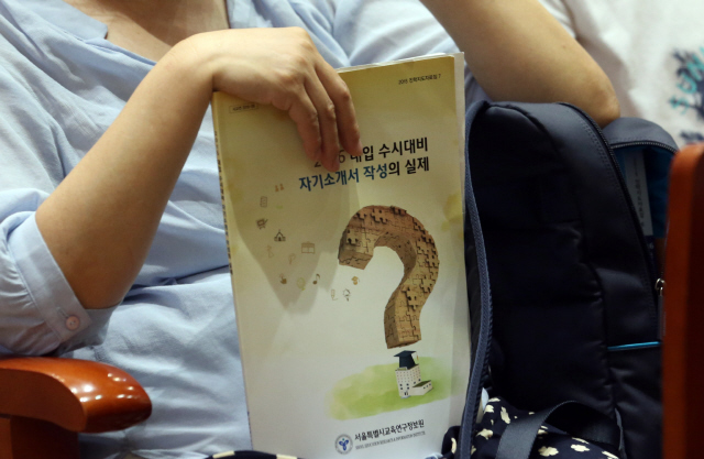 자기소개서를 쓰지 않으면 대학에 가기 어려운 시대가 됐다. 지난해 8월 서울의 한 대학에서 열린 자기소개서 작성 요령 설명회에 참석한 학부모가 자료집을 들고 있다. 연합뉴스