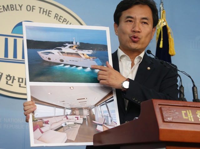 ‘친박 돌격대’ 김진태 새누리당 의원이 <조선일보> 송희영 주필의 ‘대우조선 호화 접대 비리’를 폭로하고 있다. 한겨레 박종식 기자