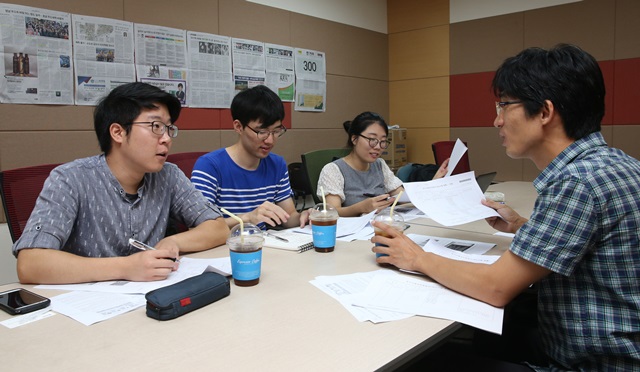 지난 8월11일 음성원 기자(오른쪽)가 <한겨레21> 교육연수생들을 상대로 강의하고 있다. 김진수 기자