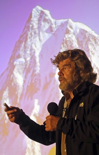 ‘전설의 산악인’ 라인홀트 메스너는 “세상 가장 높은 곳에서 두려움이 아닌 삶의 희망을 만났다”고 했다. 10월1일 메스너가 울주세계산악영화제에서 ‘태산을 움직이다’라는 주제로 강연하고 있다. 연합뉴스