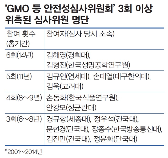 심사위원들 사이 토론과 견제를 기대하기도 어렵다. 심사위원 대부분은 생명공학·식품공학·의학·약학을 전공한 교수들로 채워져 있다. 새로운 GMO가 독성을 만들어내는지, 알레르기를 유발하는지를 과학적으로 따져보는 게 심사위원회의 역할이라는 점에서 불가피한 일이긴 하다.