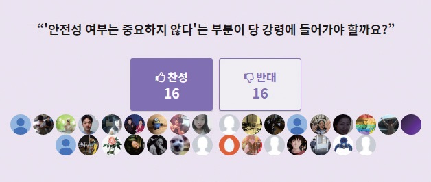 do.parti.xyz)에 이와 관련해 투표하고 의견을 나눌 수 있는 공간이 뚝딱 등장했다. 10월14일 현재 투표 참여자는 총 32명이며 의견 댓글은 15개가 달렸다. 참여자는 적지만 찬성과 반대가 16 대 16으로 팽팽하다.