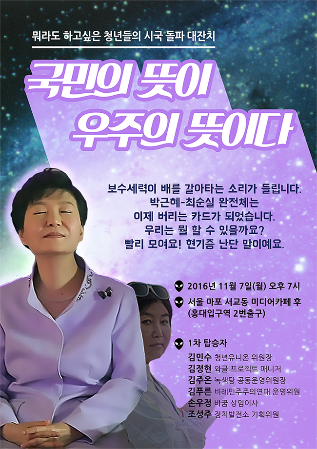 집회에 나가는 것은 낯설고 어색하지만 무언가 하고 싶은 청년들이 보기에 지금 정치권에서 나오는 이야기는 기존 권력 질서를 재배치할 뿐 변화를 모색하진 못한다. 그래서 이들은 자꾸 질문을 던진다. “대안을 논의하는 또 다른 시위를 하면 어떨까?” 이들은 가장 진지하지 않은 방식으로 가장 진지한 이야기를 하며 청년들을 호출하기로 했다. 행사 기획의 전반에는 청년 세대 특유의 냉소가 녹아 있다. 공지 사항을 비롯한 각종 게시물은 이른바 ‘병맛’(맥락없고 형편없다는 뜻의 인터넷 신조어)이다. 이를테면 행사 소개부터 이런 식이다. “답답하고 짜증나는데 도무지 뭘 해야 할지 감이 안 오는 청년들, 모여서 이야기하며 정상인 혼을 찾는 자리입니다. 누구든 편하게 나라 까고 대안 찾고, 말하기 싫으면 우주의 기운을 받으면 됩니다.” 이번 사태를 풍자한 작업들도 눈에 띈다. 최근 MBC <복면가왕>에서 ‘음악대장’(국카스텐 하현우)이 불러 청년 세대들에게 알려진 서태지의 <하여가>를 영리하게 ‘하야가’로 제목을 바꿔 뮤직비디오를 만들었다. 가사가 절묘하다. “너에게 모든 걸 뺏겨버렸던 마음이 다시 내게 돌아오는 걸 느꼈지. 너는 언제까지나 나만의 나의 연인이라 믿어왔던 내 생각은 틀리고 말았어.” 청년들이 짜는 ‘새판’ 기이한 우주를 향해 날아가는 우주선의 첫 탑승자로는 김민수 청년유니온 위원장, 김정현 와글 프로젝트 매니저, 김주온 녹색당 공동운영위원장, 김푸른 비례민주주의연대 운영위원, 손우정 바꿈 상임이사, 조성주 정치발전소 기획위원 등이 나선다. 그동안 사회 각 영역에서 청년 문제를 이야기해온 ‘전문가’들이 모여 시민과 액션플랜을 논의한다. 실천 방안은 온라인 플랫폼 ‘가브크래프트’(http://govcraft.org/campaigns/6)에서 실시간 공유된다. 신소윤 기자 yoon@hani.co.kr