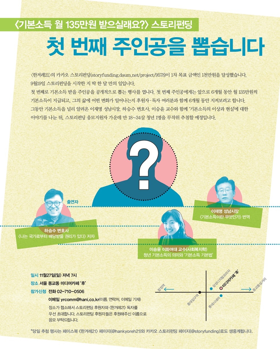 그동안 기본소득을 널리 알려온 이재명 성남시장, 하승수 변호사, 이승윤 교수와 함께 ‘기본소득의 이상과 현실’에 대한 이야기를 나눈 뒤, 스토리펀딩 응모지원자 가운데 만 18~34살 청년 1명을 무작위 추첨할 예정입니다.