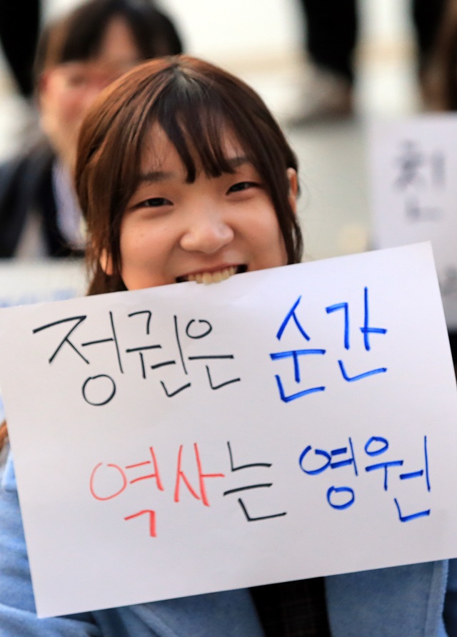 지난해 11월21일 서울 광화문에서 열린 ‘국정교과서 반대 7차 청소년 거리행동’에 참석한 학생이 중·고교 역사 교과서 국정화에 반대하는 내용의 손팻말을 들고 있다. 한겨레 김태형 기자