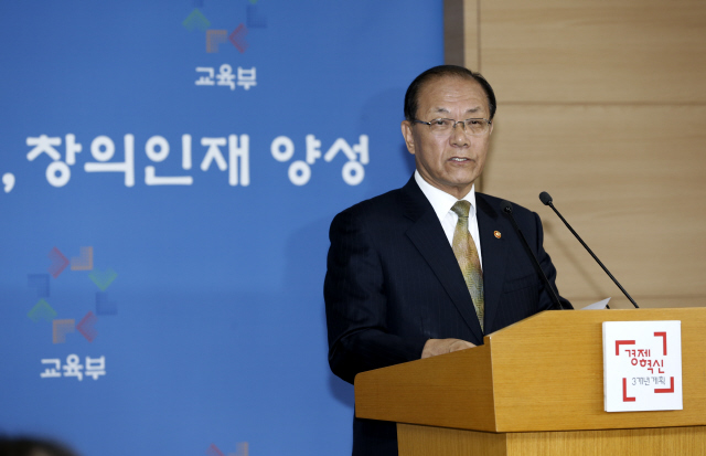 지난해 10월27일 서울 세종로 정부서울청사에서 황우여 교육부 장관이 ‘국정화 대비 비밀 TF’ 운영 논란에 대한 해명 기자회견을 하고 있다. 기자회견 이틀 전 야당 의원들은 서울 대학로 국립국제교육원에서 교육부 공무원들이 ‘비밀 TF’를 운영하고 있다고 폭로했다. 한겨레 김명진 기자