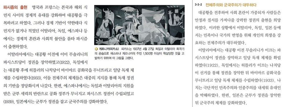 박정희 정권의 독재를 미화하듯 제2차 세계대전을 초래한 독일·이탈리아·일본의 전체주의를 정당화하는 듯한 서술도 있다. 국정교과서는 전체주의 대두와 관련해 “대공황을 전후하여 사회 혼란이 가중되자 사람들은 안정과 질서를 가져다줄 강력한 정권의 출현을 희망하였다”며 마치 전체주의가 대중의 요구에 부응하여 등장한 체제인 것으로 기술했다. 기존 검정교과서들이 전체주의에 대한 대중의 지지가 가능했던 배경에 선동을 통한 여론 조작, 언론 통제, 일당 독재 체제 등의 이면이 있었다고 서술한 것과는 상반된다.
