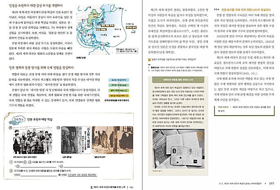 제2차 세계대전 중 발생한 대량학살 사건을 다룬 두산동아 출판사의 검정교과서(왼쪽)가 홀로코스트, 난징 대학살, 한국에도 무수한 피해자가 있는 일본군 ‘위안부’ 문제를 함께 제시한 반면 국정교과서에는 두 사건에다 소련군이 자행한 카틴숲 학살 사건을 언급했다. 전국역사교사모임, 교육부 제공 (※이미지를 누르면 더 크게 보실 수 있습니다.)