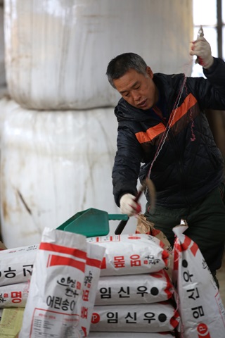 11월30일 전북 정읍시 덕천면의 축사에서 이효신 전국농민회총연맹 부의장이 한우 사료를 준비하고 있다. 류우종 기자