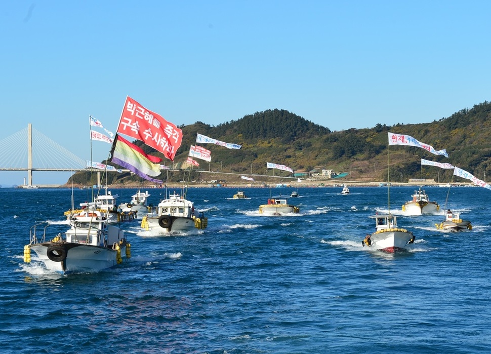 지금 우리는 다들 생업으로 돌아간 상태이다. 삼치와 불볼락을 낚고(결국 죽는다), 가두리 물고기에게 사료를 주고, 기름을 팔고 있다. 그러나 끝이 아니란 것은 잘 알고 있다. 국감과 특검, 그리고 헌재에게서 시선을 떼지 않는다. 집회 현장에 묶어놓은 바다의 깃발들은 또다시 함성이 필요할 때를 기다리며 그 자리에서 펄럭이고 있다.