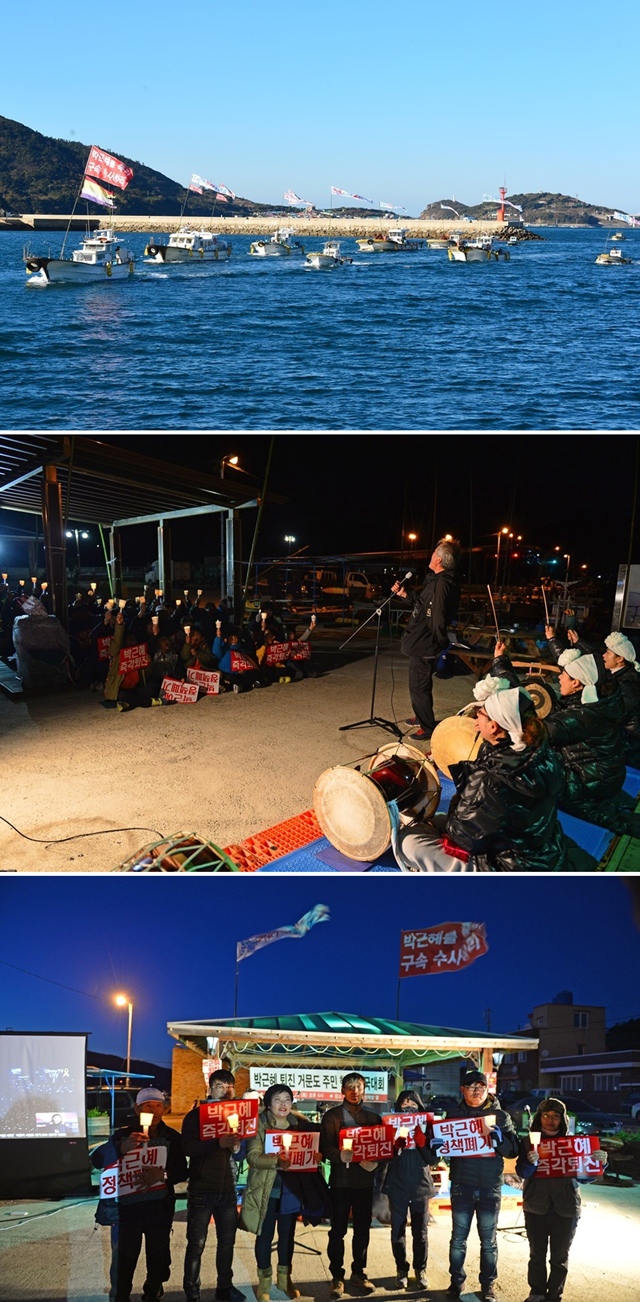 지난 12월10일 거문도 앞바다에서 바닷바람을 가르며 나타난 ‘촛불 함대’(맨 위쪽). 그날 저녁 열린 촛불집회 풍경들.