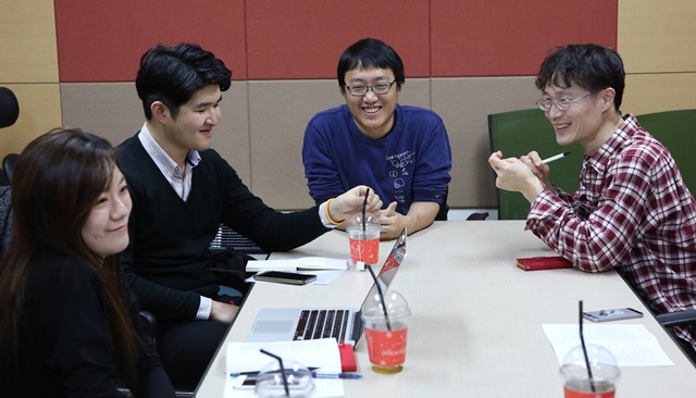 2016년 6월부터 <한겨레21>과 ‘바글시민 와글입법’ 프로젝트를 함께 만들어온 주인공들이 12월21일 오후 서울 공덕동 한겨레신문사 회의실에서 웃으며 이야기를 나누고 있다. 왼쪽부터 박은지 빠흐띠 매니저, 박지호 경제정의실천시민연합 간사, 권오현 빠흐띠 대표, 임성빈 ‘나는알아야겠당’ 당원. 류우종 기자