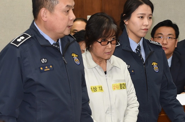 박근혜 정부의 ‘비선 실세’로 불리는 최순실씨가 1월5일 오후 서울 서초동 서울중앙지법에서 열린 첫 번째 공판에 출석하고 있다. 사진공동취재단