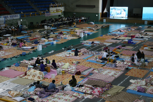 2014년 4월25일 전남 진도체육관에서 세월호 피해자 가족들이 실종자 수색 소식을 기다리고 있다. 한겨레 신소영 기자