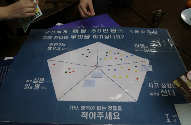 ‘띄어쓰기 프로젝트’팀이 마련한 대전 은행동 으능정이 길거리 캠페인에서 시민들이 ‘기본소득을 받는다면 무엇을 하고 싶은지’ 스티커와 포스트잇으로 표시했다. 김진수 기자