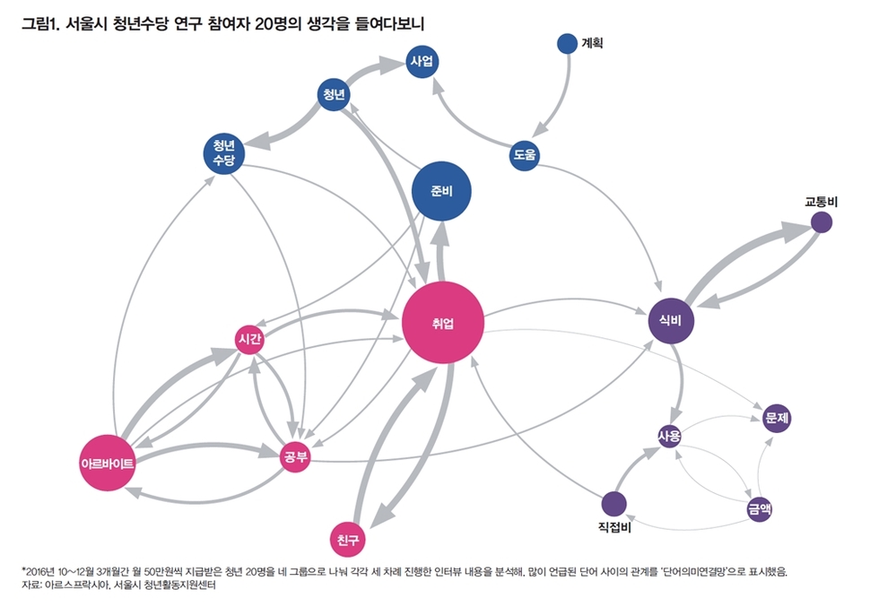 다른 연구 참여자들의 마음도 비슷했다. ‘아르스프락시아’가 그룹인터뷰 내용을 분석해 그려본 단어의미연결망(상단 그림1)을 보면 ‘청년수당’→‘사업’으로→자신의 ‘계획’에→‘도움’을 받았다는 생각이 큰 비중을 차지한다. ‘취업’ 준비를 위해 ‘아르바이트’를 줄이고 ‘공부’할 ‘시간’을 확보했다는 만족감도 컸다.