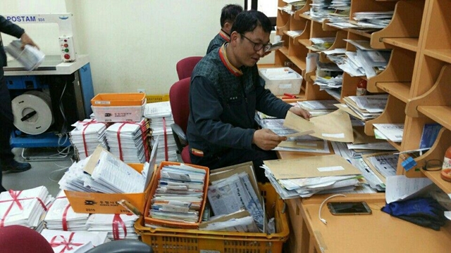 지난 2월5일 동맥경화로 갑자기 사망한 충남 아산 영인우체국 집배원 조만식씨가 생전 우편물을 분류하는 모습. 집배원들은 일이 몰려 평일 저녁 또는 휴일에도 다음날 배달할 우편물을 분류하는 ‘무료 노동’에 시달리는 것으로 알려졌다. 고 조만식씨 유가족 제공
