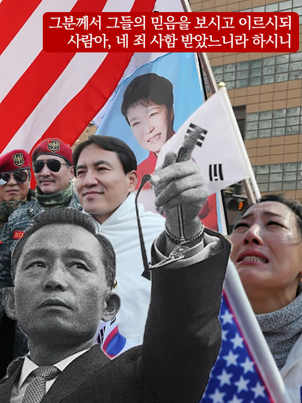박근혜 탄핵에 반대하는, 만만찮은 수의 사람들이 거리로 나오고 있다. 태극기와 성조기를 함께 흔들며 “탄핵 각하”를 선언하고 “빨갱이를 죽이자”고 외친다. 진보 언론은 물론 보수 언론마저 국정 농단 파문에서 박근혜가 문제의 핵심임을 지적하지만, 이들은 아랑곳하지 않는다. 모든 언론이 조작된 뉴스로 사람들을 선동하고 있다고 주장한다. 이들의 광장은 종교적 맹신으로 가득 차 있다. 이들은 과연 무엇을 말하고 싶은 걸까.