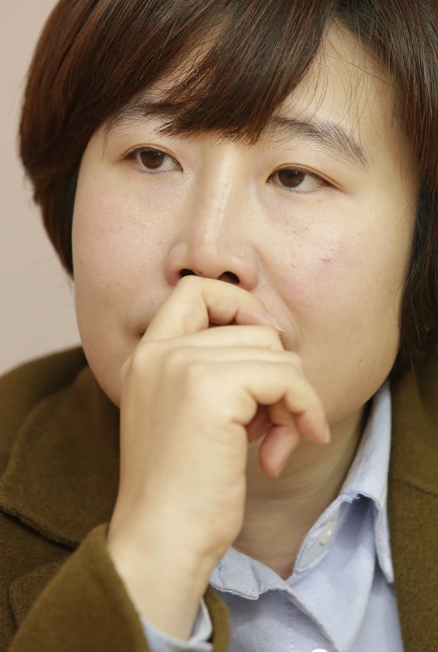 박성현 ‘우리함께’ 사무국장이 2월14일 밤 경기도 안산의 사무실에서 김승섭 교수와 인터뷰하고 있다. 김진수 기자