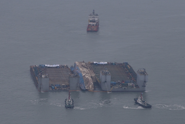 하루를 넘긴 3월24일 아침 6시45분에야 작업이 끝나고 인양이 재개됐다. 그리고 이날 오전 11시10분에야 세월호는 목표로 한 수면 위 13m까지 올라왔다. 2대의 잭킹 바지선에 묶인 세월호는 5대의 예인선에 끌려 침몰 지점에서 3km 떨어진 반잠수선으로 옮겨졌다. 반잠수선은 세월호를 실은 곳에서 87km 떨어진 목포신항으로 이동한다, 모든 작업이 순조롭게 이뤄진다면 반잠수선이 목포신항에 도착하는 것은 4월 초가 될 전망이다.