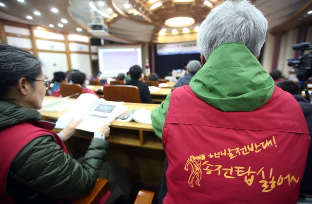 3월23일 서울 여의도 국회의원회관에서 경남 밀양 송전탑 피해 주민들이 마을공동체 파괴 실태 조사 보고서 발표를 유심히 듣고 있다. 정용일 기자