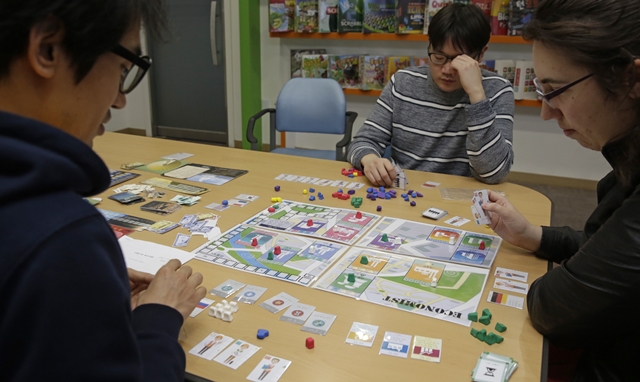 ‘기본소득 보드게임 국제공모전’ 주관사인 코리아보드게임즈 직원들이 경기도 파주에 있는 사무실에서 2등 당선작 <이코노미스트> 게임을 직접 해보고 있다. 김진수 기자