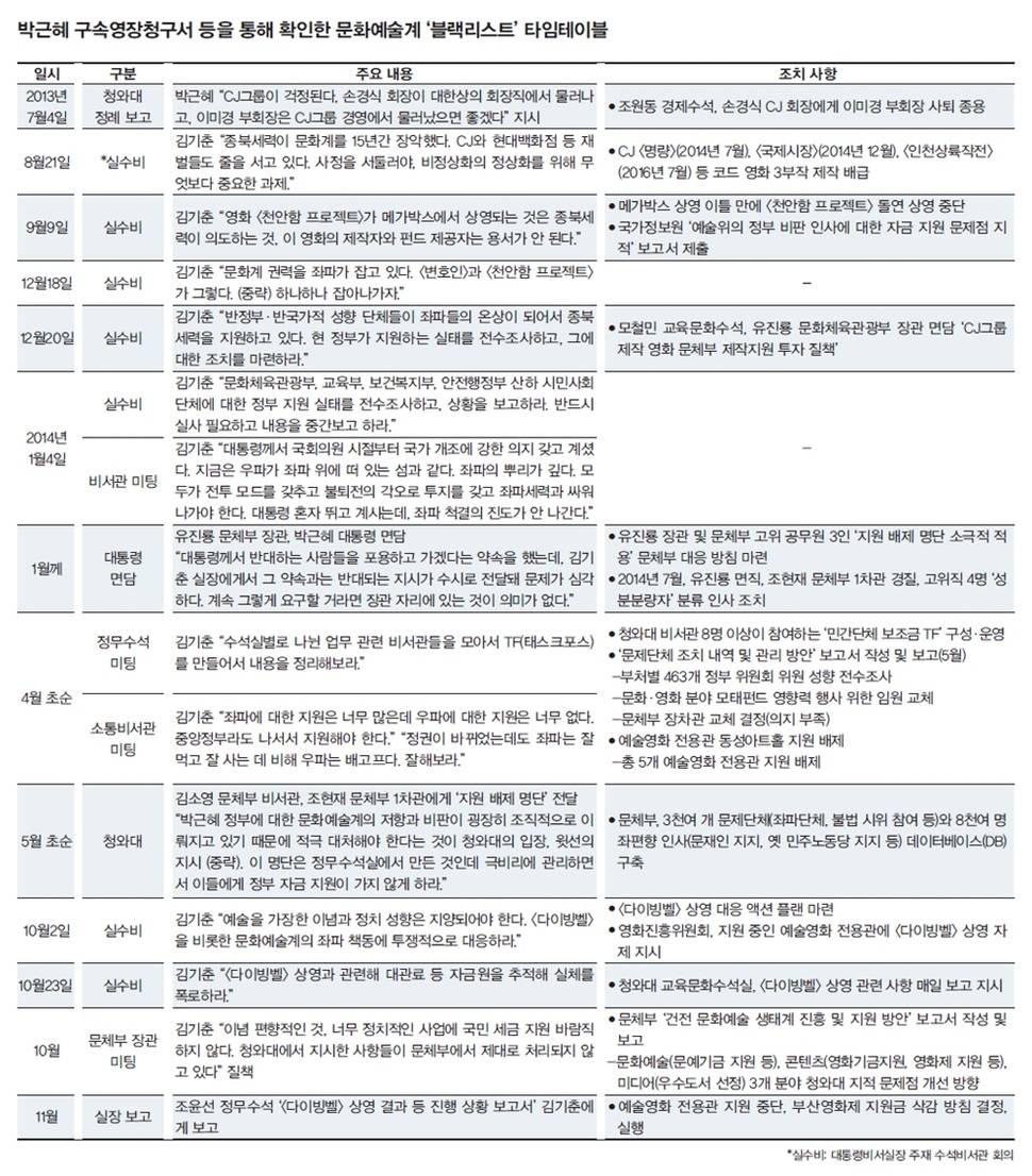“‘문화 융성’ 시대를 국민 여러분과 함께 열어가겠습니다.” 2013년 2월25일, 박근혜 전 대통령은 제18대 대통령 취임사에서 이렇게 선언했다. ‘문화’는 당시 취임사에서 ‘경제, 창조, 행복’과 함께 가장 많이 언급됐다. 4년1개월 뒤 박 전 대통령은 ‘문화예술계 블랙리스트’ 관련 범죄 등의 혐의로 구속됐다. <한겨레21>과 <씨네21>이 함께 입수한 박 전 대통령에 대한 검찰의 구속영장을 보면, 문화계 범죄 관련 내용이 전체 91쪽 가운데 총 26쪽에 달한다. 이는 박 전 대통령이 이재용 삼성전자 부회장 등에게서 받은 뇌물 혐의 관련 내용(60쪽) 다음으로 많다.