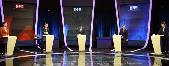 01 26.4%. 대선 TV토론이 도입된 1997년 이후 최고 시청률이었다. 그만큼 4월19일 대선 후보들이 사전 원고 없이 선 채로 2시간 동안 한 최초 ‘스탠딩’ TV토론(KBS 주관)에 대한 유권자의 관심은 높았다. 정작 토론 내용엔 알맹이가 없었다. 해묵은 북한 ‘주적’ 문제, 대북 송금 특검, 유엔 북한인권결의안에 대한 ‘색깔론’만 뜨거웠다. 지지율 선두인 문재인 더불어민주당 후보에게 18번의 질문이 몰렸고, 심상정 정의당 후보는 한 번도 질문을 받지 못했다. 후보들의 자유로운 이동이나 제스처도 전혀 없었다. 토론회가 끝난 뒤 홍준표 자유한국당 후보는 “체력장 테스트 하는 것 같았다. 무릎이 아팠다”고 말했다.