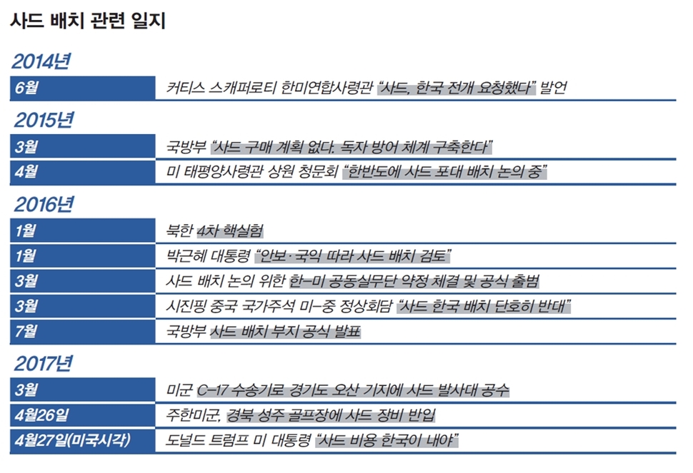 꼬인 실타래를 풀려면 최근 한국과 미국이 진행한 사드 배치 협의 과정을 복기해야 한다. 한국과 미국이 사드 배치 ‘실무 논의’를 공식 시작한 것은 2016년 3월이다. 그해 1월4일 북한은 4차 핵실험을 단행했고, 박근혜 대통령은 1월13일 신년 대국민 담화 및 기자회견에서 “안보와 국익을 고려해 사드 배치를 검토하겠다”고 했다. 두 달 뒤 3월4일 국방부는 “국민의 생명과 재산을 보호하고 국가 안위를 지키기 위한 책무를 완수하기 위한 일환”이라며 주한미군과 사드 배치 관련 공동실무단 구성 약정을 체결하는 데 이르렀다.