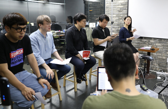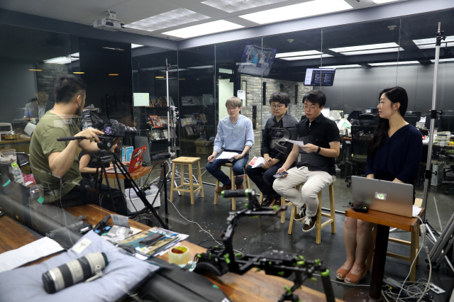 <허프포스트코리아>와 <한겨레21>은 이날 방송으로 각각 누적 조회 수 5만 회, 3만 회를 기록했다. 서울 마포구 <허프포> 사무실 내 스튜디오 모습.
