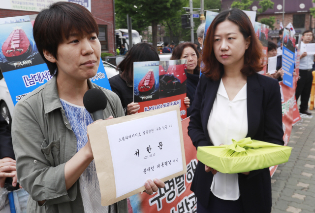 문재인 대통령의 업무 개시일인 5월10일 오전 청와대 인근 서울 청운동주민센터 앞에서 열린 스텔라데이지호 선원 수색 작업 재개 촉구 집회에서 허경주 실종자 가족 공동대표가 문 대통령에게 전할 서한문을 읽고 있다. 연합뉴스
