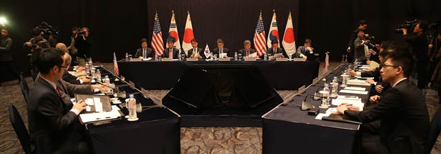 6자회담이 사실상 기능을 멈춘 뒤 한·중·일 3개국 수석대표들이 모여 북핵 문제 해결 방안을 논의했지만 해결의 길은 멀기만 하다. 2016년 5월 서울 소공동 롯데호텔에서 열린 수석대표 회의. 한겨레 박종식 기자