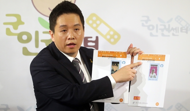임태훈 군인권센터 소장이 4월17일 동성애자 군인에 대한 표적수사 증거를 공개하고 있다. 연합뉴스